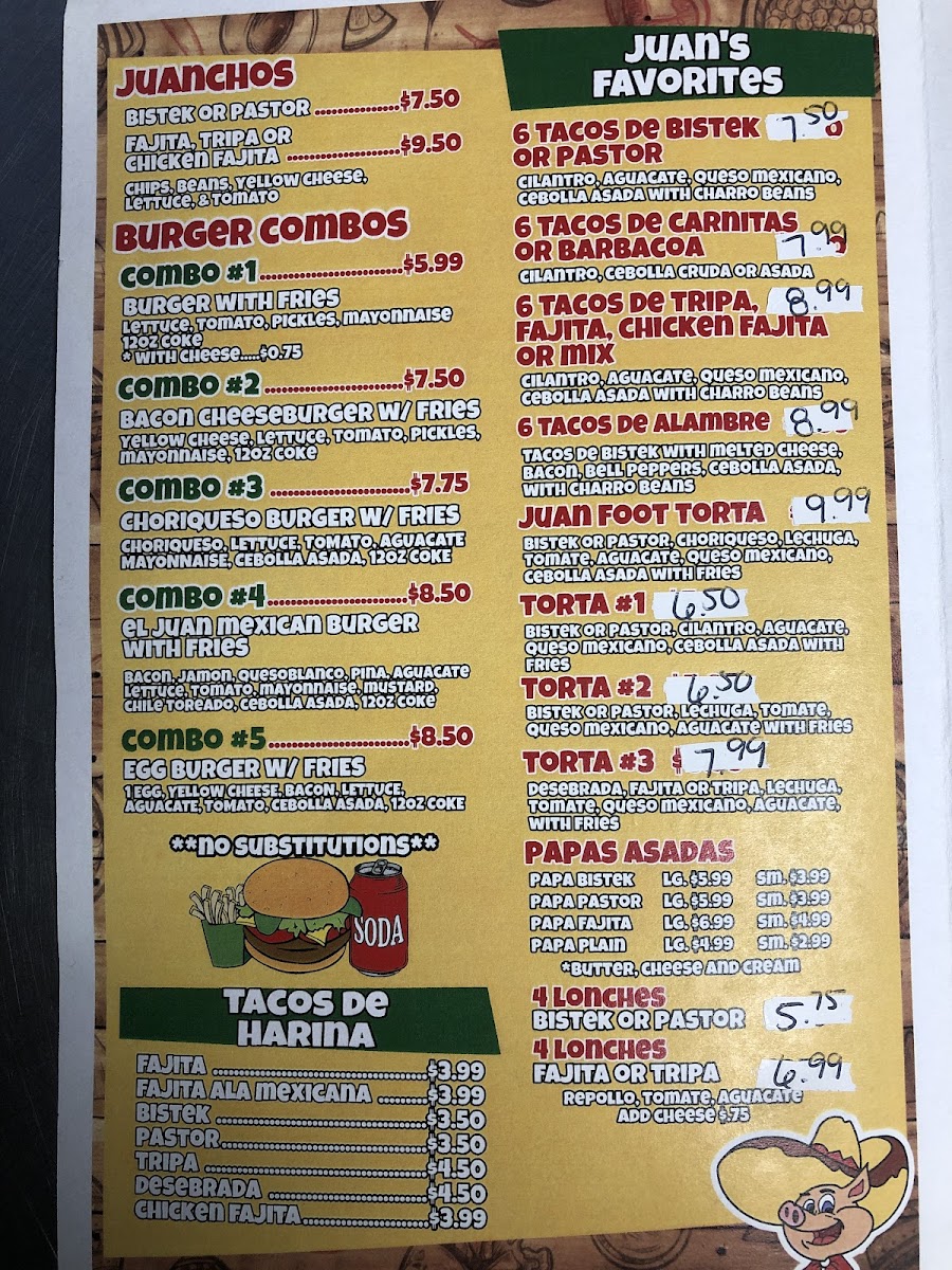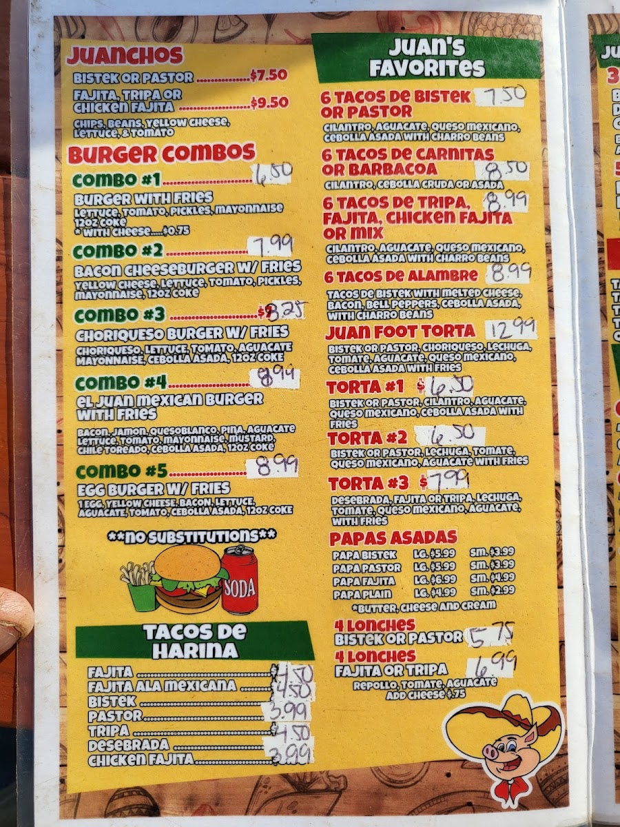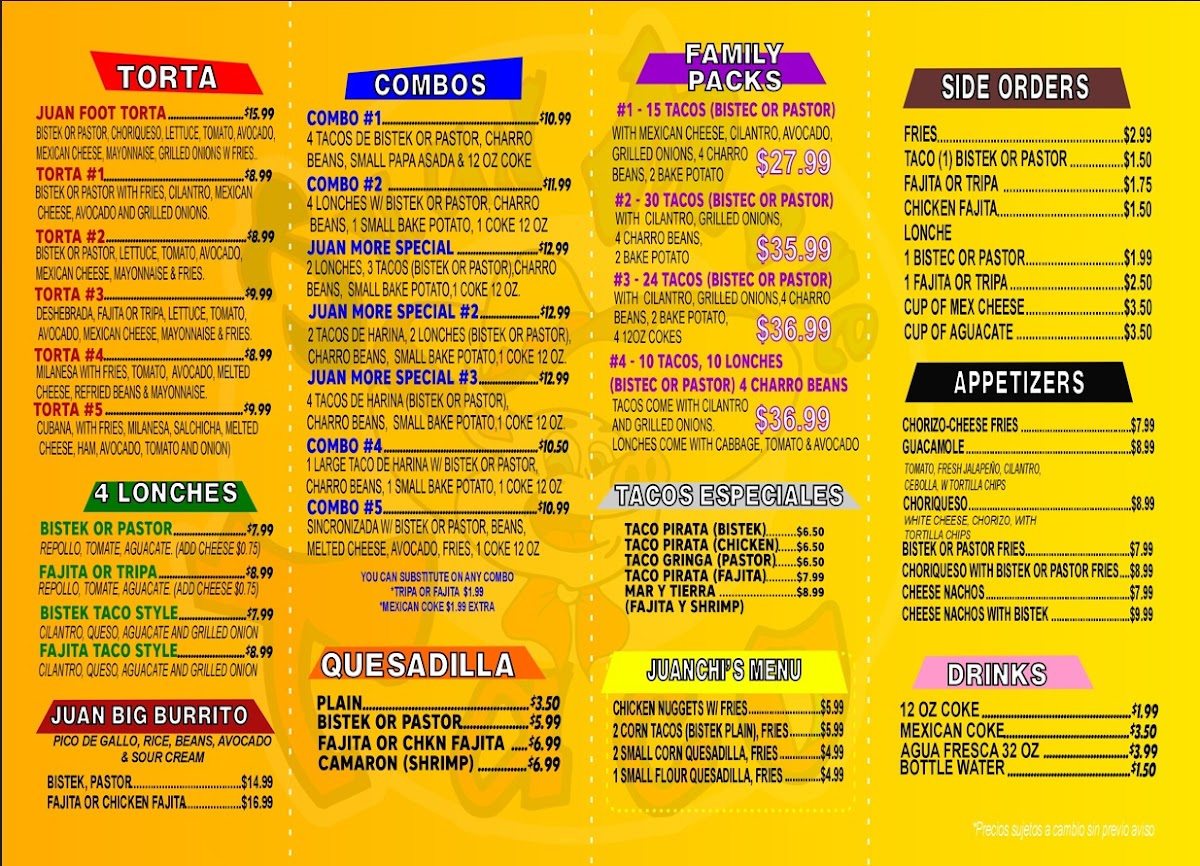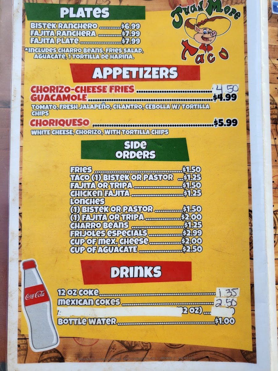 The menu at Juan More Taco offers a variety of traditional Mexican dishes, focusing primarily on tacos, tortas, and other classic options. Food selections are organized into categories such as street tacos, specialty tacos including Tacos Al Pastor, Tacos De Bistec, and Taco De Tripa, as well as larger sandwiches like the Juan Foot Torta and Lonches. For side dishes, the menu includes items like Charro Beans, Frijoles Pirata, and several types of fries, including Chorizo Cheese Fries and Choriqueso Fríes.