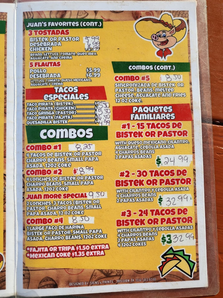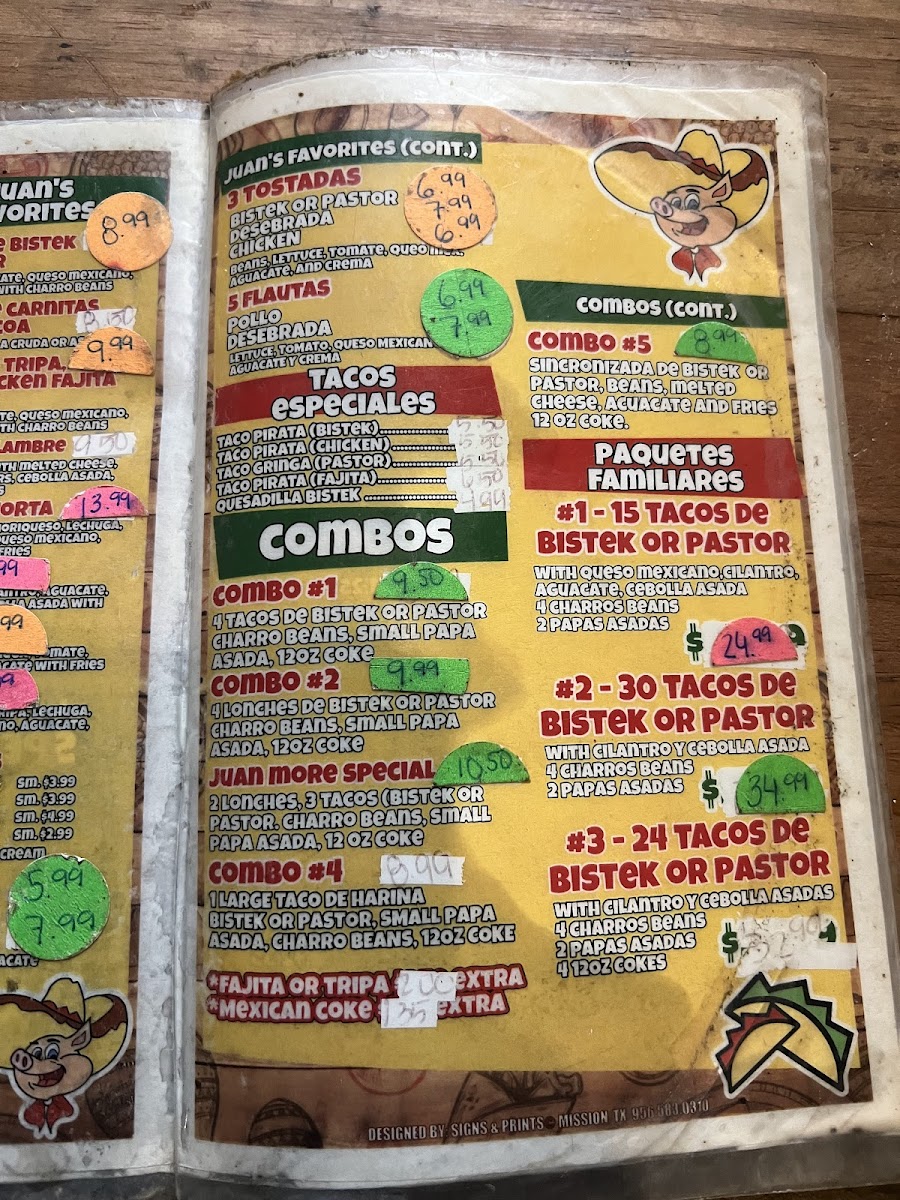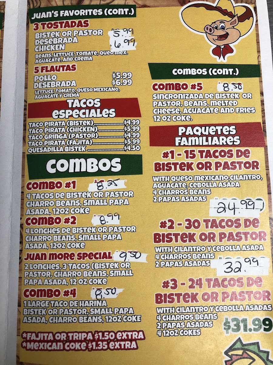 The menu at Juan More Taco offers a variety of traditional Mexican dishes, focusing primarily on tacos, tortas, and other classic options. Food selections are organized into categories such as street tacos, specialty tacos including Tacos Al Pastor, Tacos De Bistec, and Taco De Tripa, as well as larger sandwiches like the Juan Foot Torta and Lonches. For side dishes, the menu includes items like Charro Beans, Frijoles Pirata, and several types of fries, including Chorizo Cheese Fries and Choriqueso Fríes.